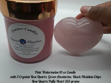 Pink Watermelon 10 oz w/ 3crystals and a 3 1/2 x 3 1/2 inch Rose Quartz heart for